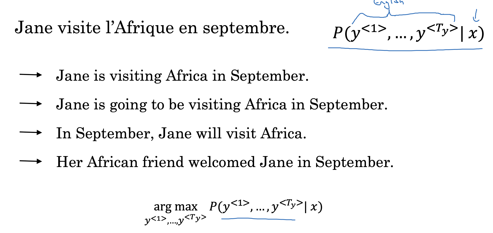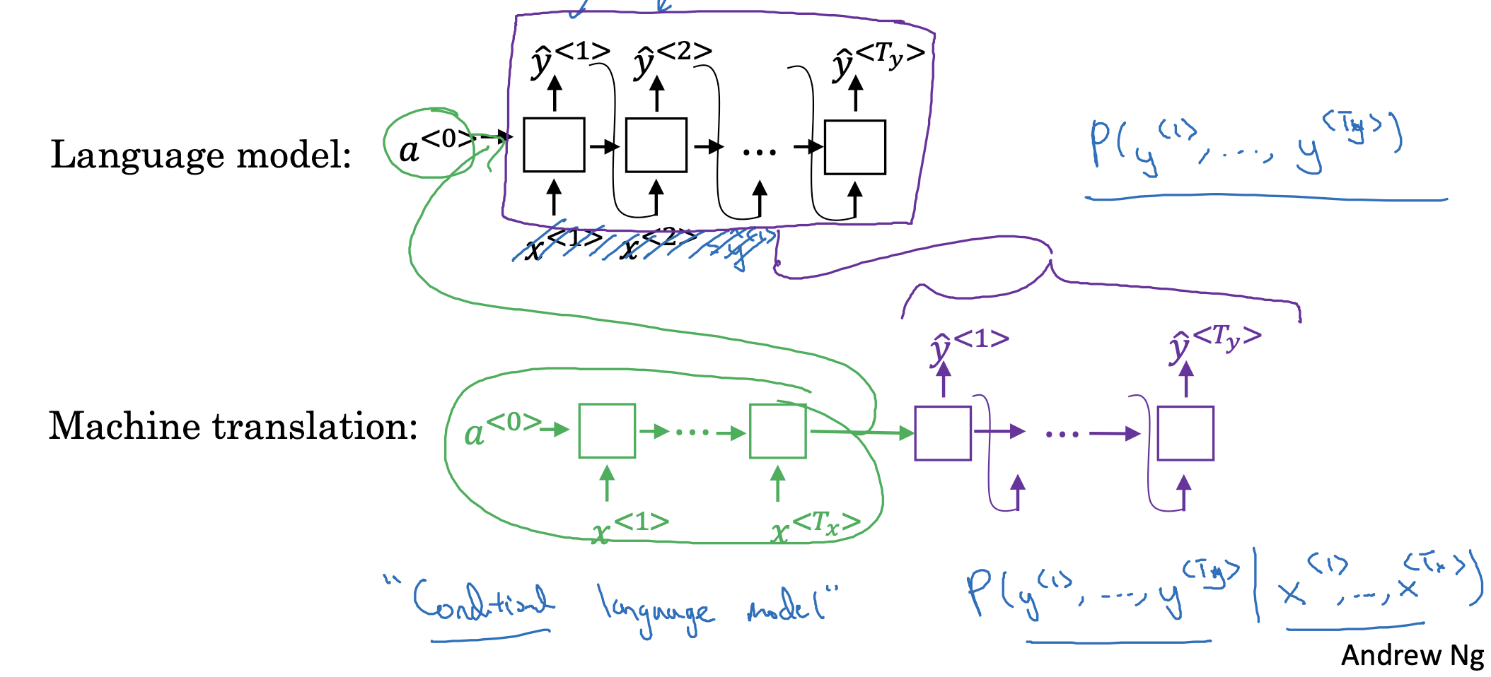 machine translation에서는 input x가 예측값 y hat과 동시에 입력으로 들어가지 않는 다는 점을 제외하면 구조가 유사합니다.
