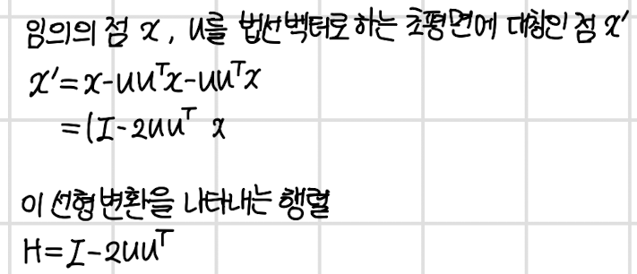 - 공간의 임의의 점 x를 원점을 지니는 초평면에 대해 대칭인 점 x'로 옮기는 변환
