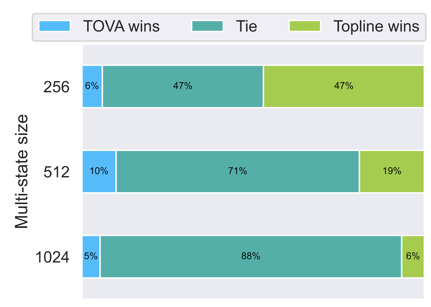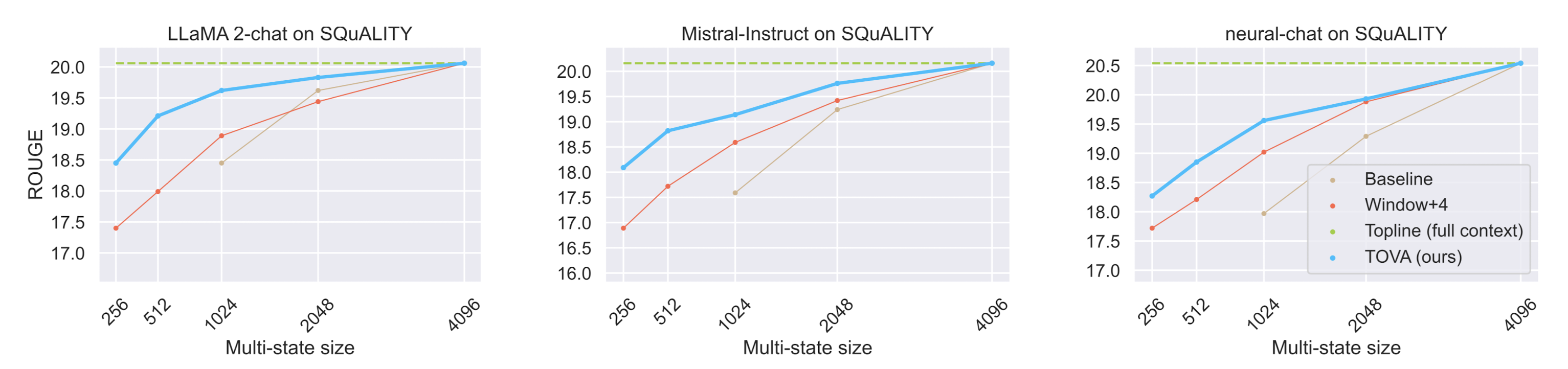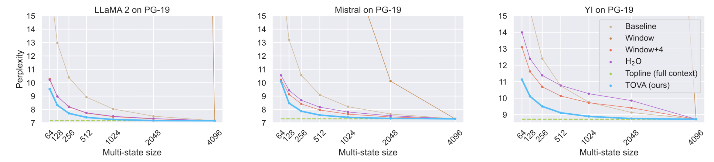 아래의 그래프는 TOVA 방식을 적용했을 때의 출력과 Topline을 비교한 것으로, 512 토큰 이상을 처리할 때부터 성능이 급격히 향상되는 것을 알 수 있습니다.