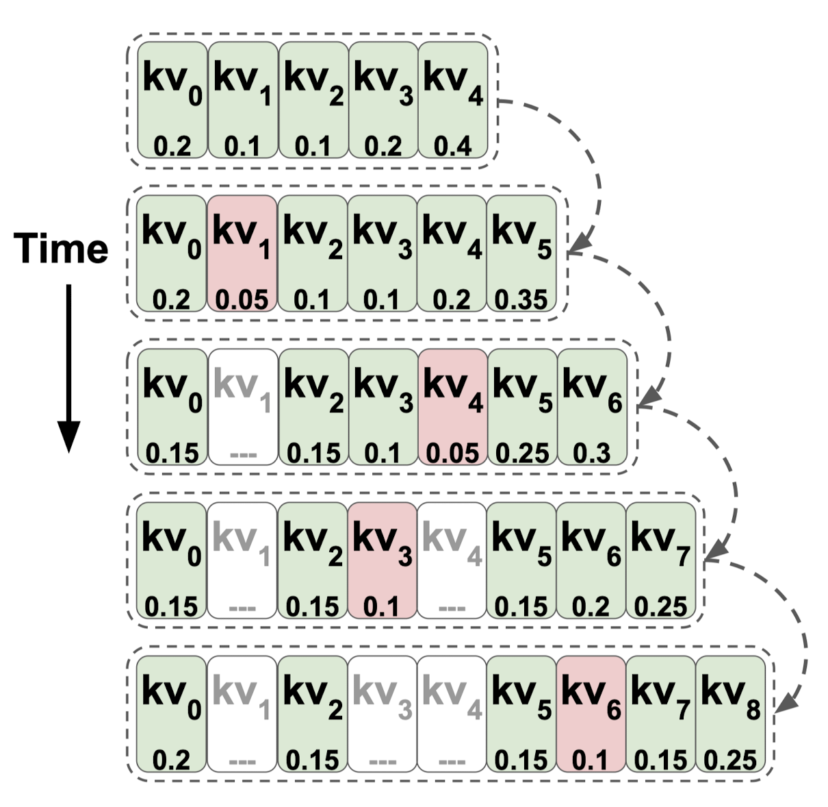 이전 토큰에 대한 attention 가중치를 기반으로 top states를 보유(유지)합니다.
