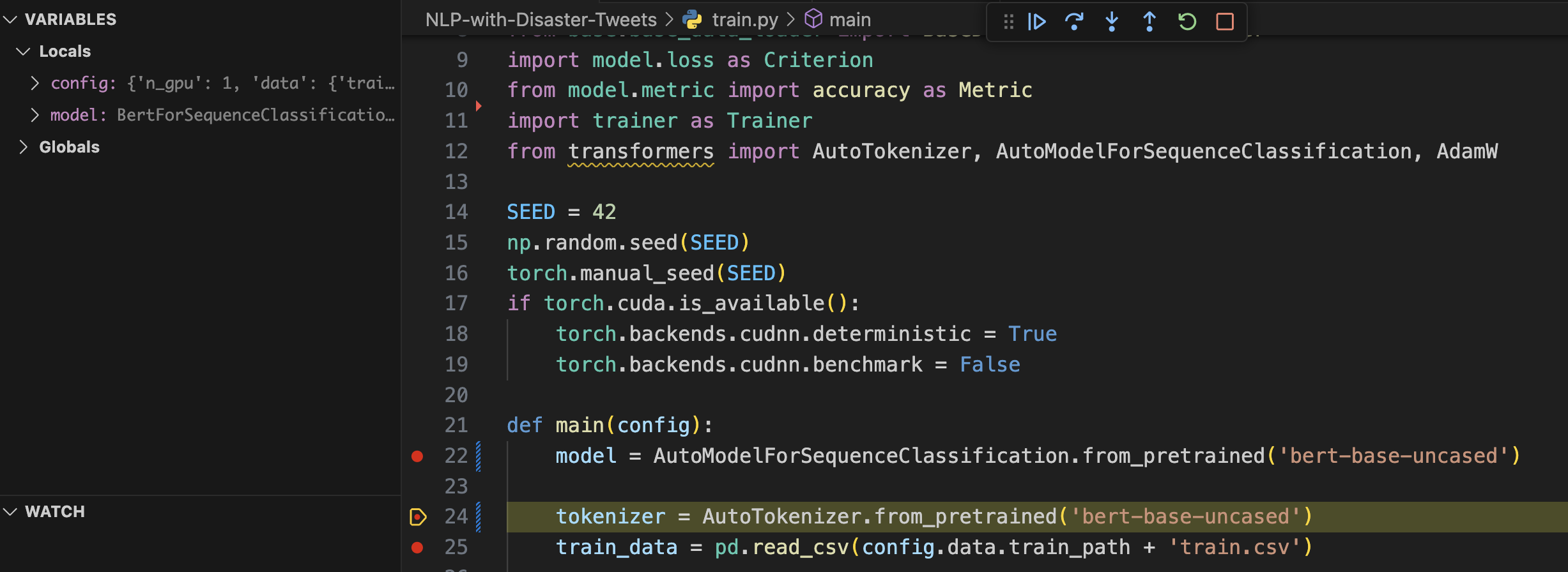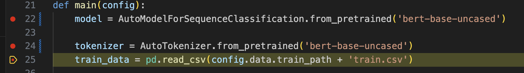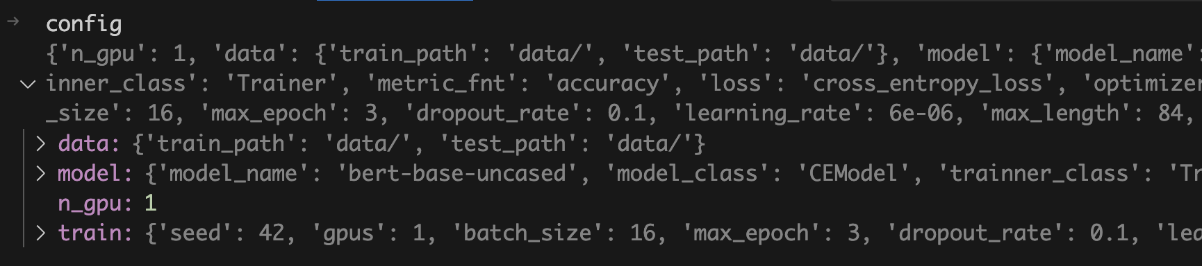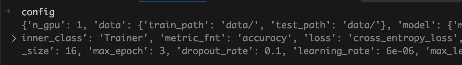 즉 모델과 토크나이저를 불러온 상황이고, main 함수가 전달받은 config에 대한 값도 저장되어 있다는 걸 좌측의 VARIABLES 탭을 통해 확인할 수 있습니다.