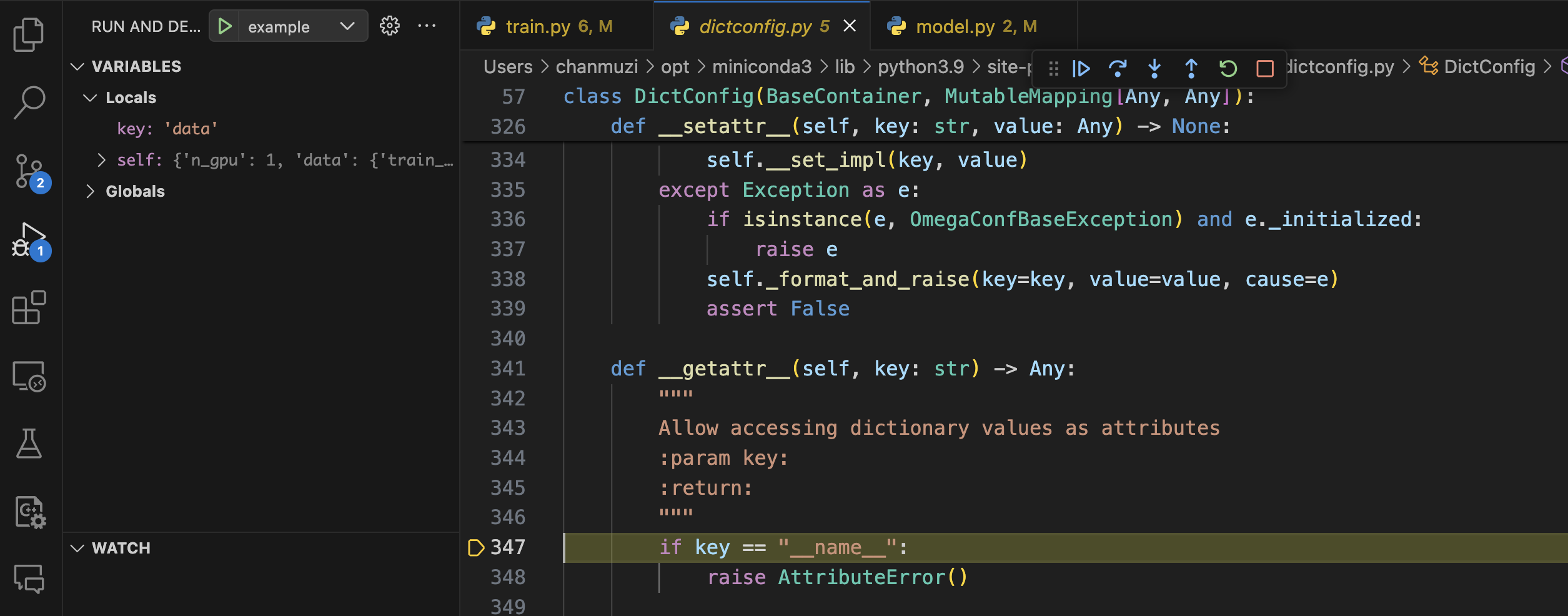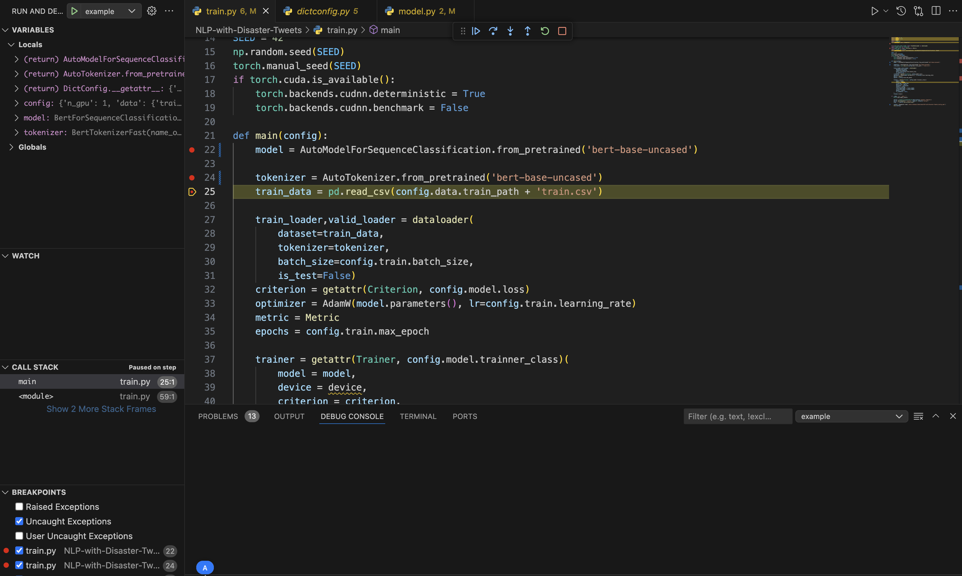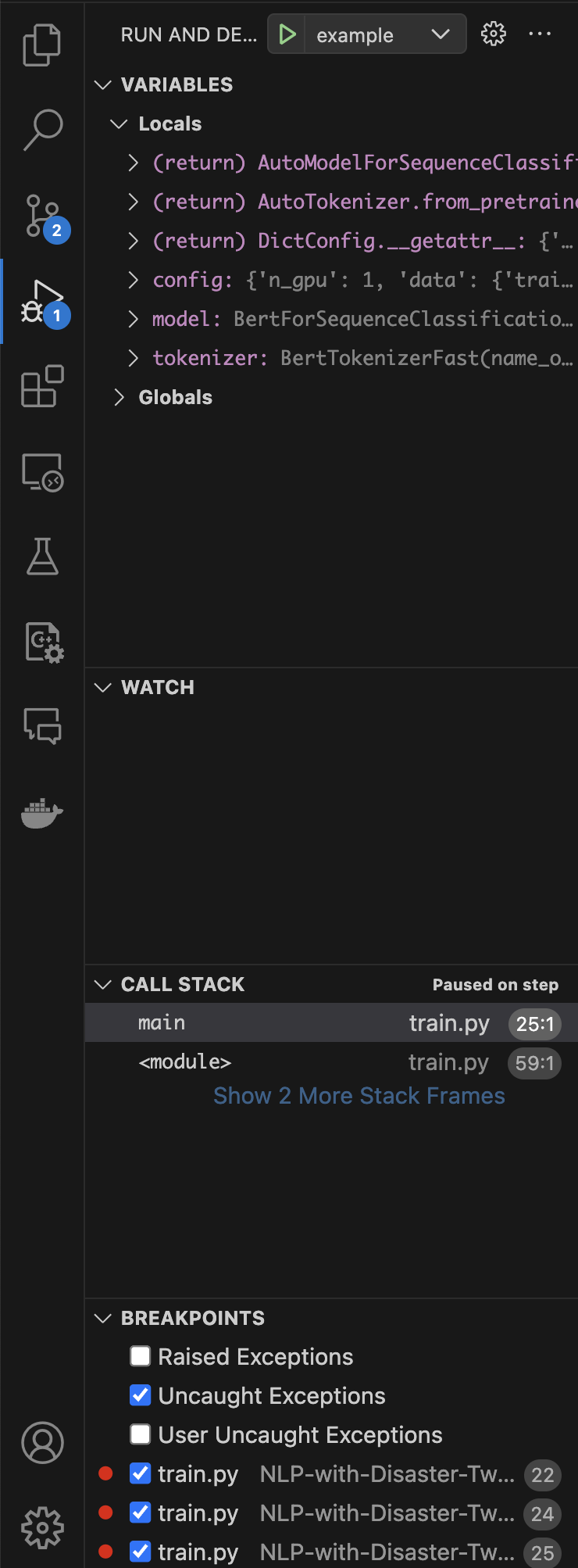 즉 모델과 토크나이저를 불러온 상황이고, main 함수가 전달받은 config에 대한 값도 저장되어 있다는 걸 좌측의 VARIABLES 탭을 통해 확인할 수 있습니다.
